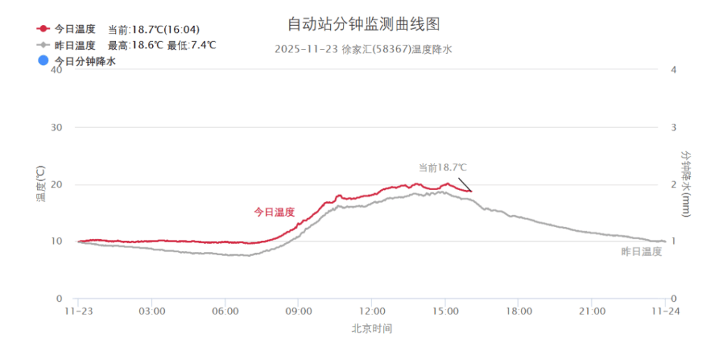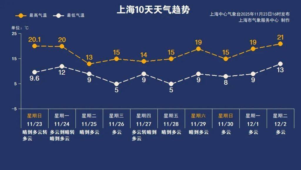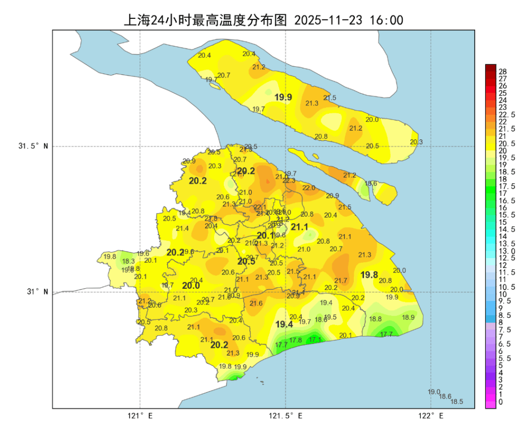 上海气象部门预报,明天白天天气与今天(11月23日)类似,最高气温仍可达20℃,受冷空气影响,夜里起气温开始下降,后天最高温只有13℃。