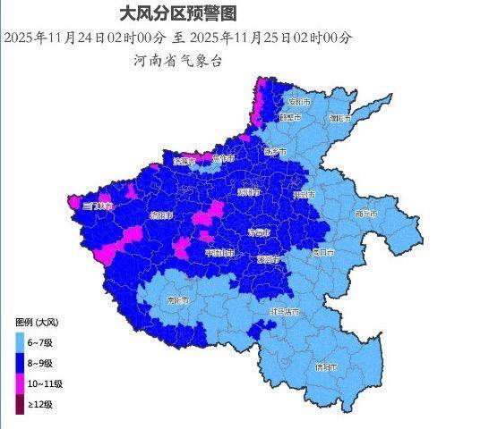 河南省气象台发布大风蓝色预警。受冷空气影响,预计11月24日2时至25日2时,河南全省西北风5级左右,阵风7级,其中安阳西部、新乡西部和南部、焦作、济源、三门峡、洛阳、郑州、开封西部、平顶山、许昌、漯河、周口北部、南阳西部和北部、驻马店北部部分县(市、区)阵风8到9级,局地10到11级。淮河以北伴有扬沙或浮尘。