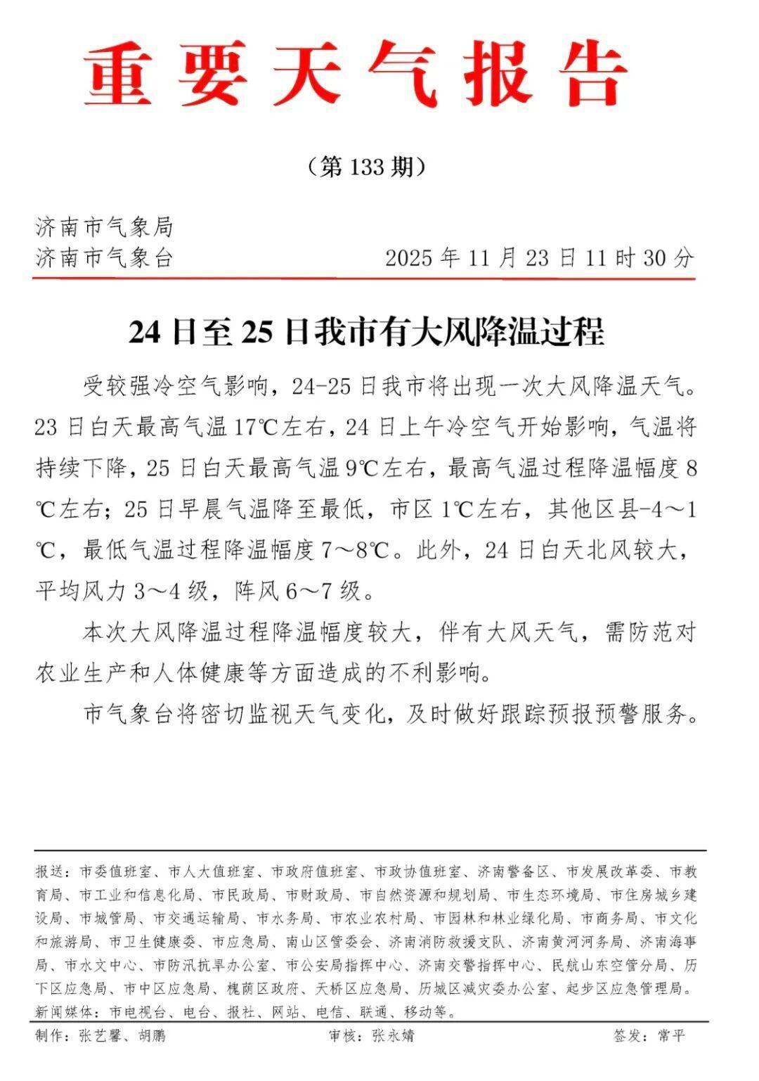 11月23日,济南市气象台发布重要天气预报。