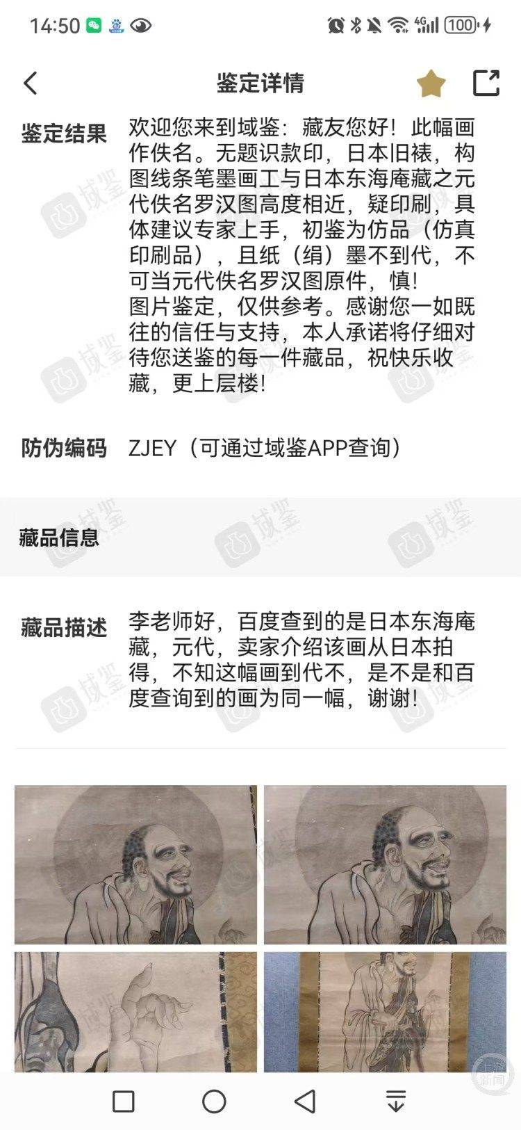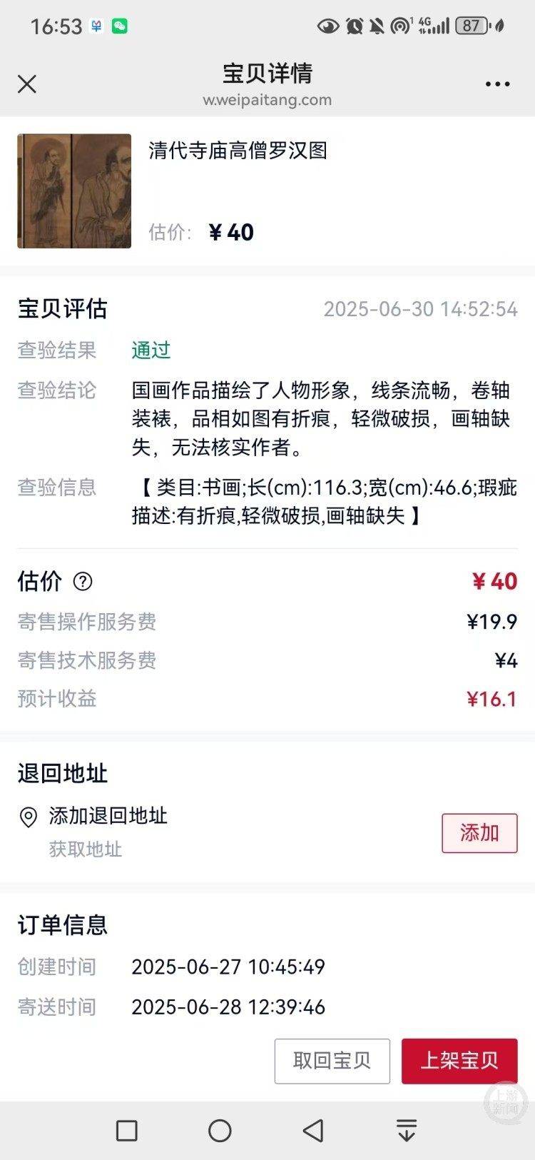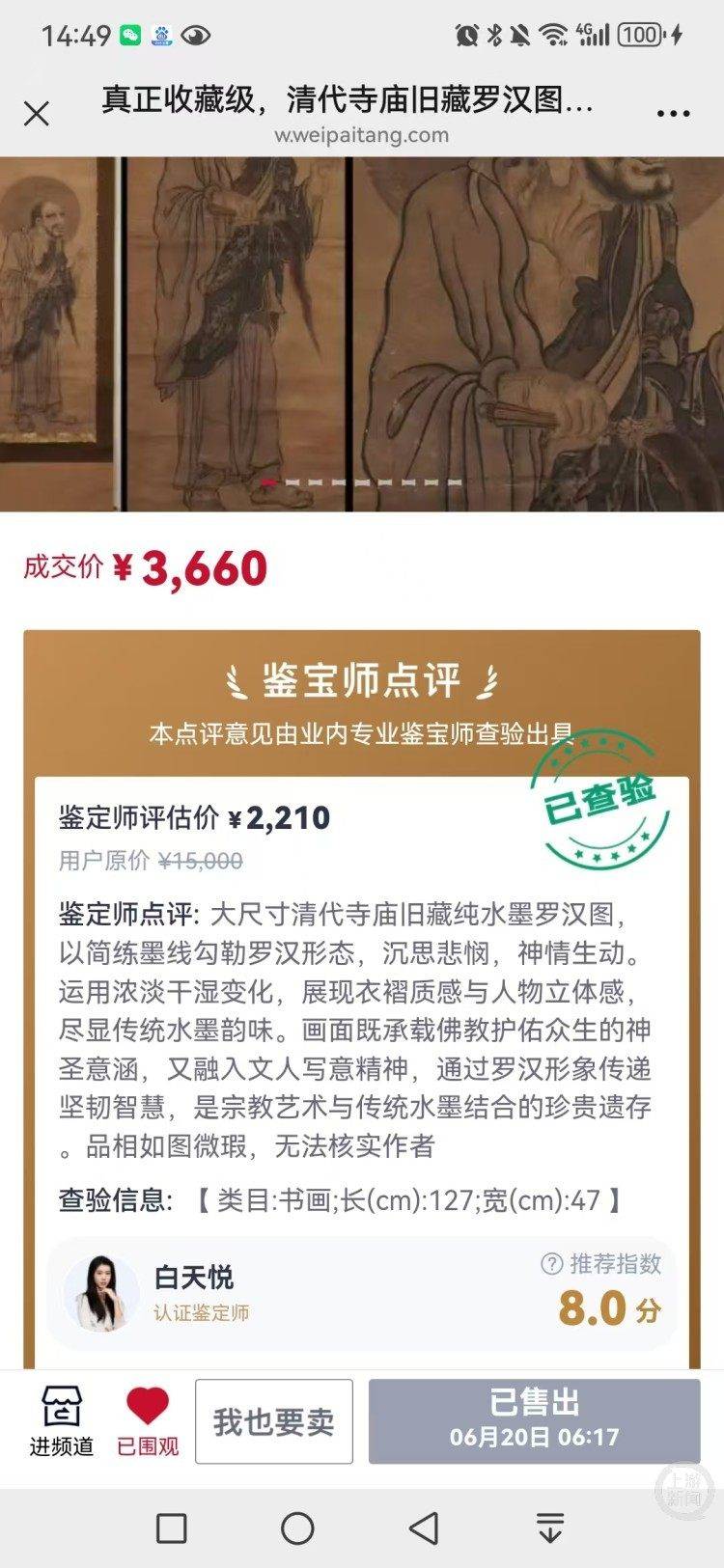 “这幅画被鉴定机构鉴定为仿真印刷品,真迹藏于日本东海庵。”来自北京的王先生告诉上游新闻(报料邮箱:cnshangyou@163.com)记者,今年6月19日,他在微拍堂APP上以3660元竞拍的“清代罗汉图” 被鉴定机构鉴定为仿真印刷品,真迹藏于日本东海庵,微拍堂不仅拒绝退款退货,再次寄售时估价仅为40元,这种处理方式让他很难接受。