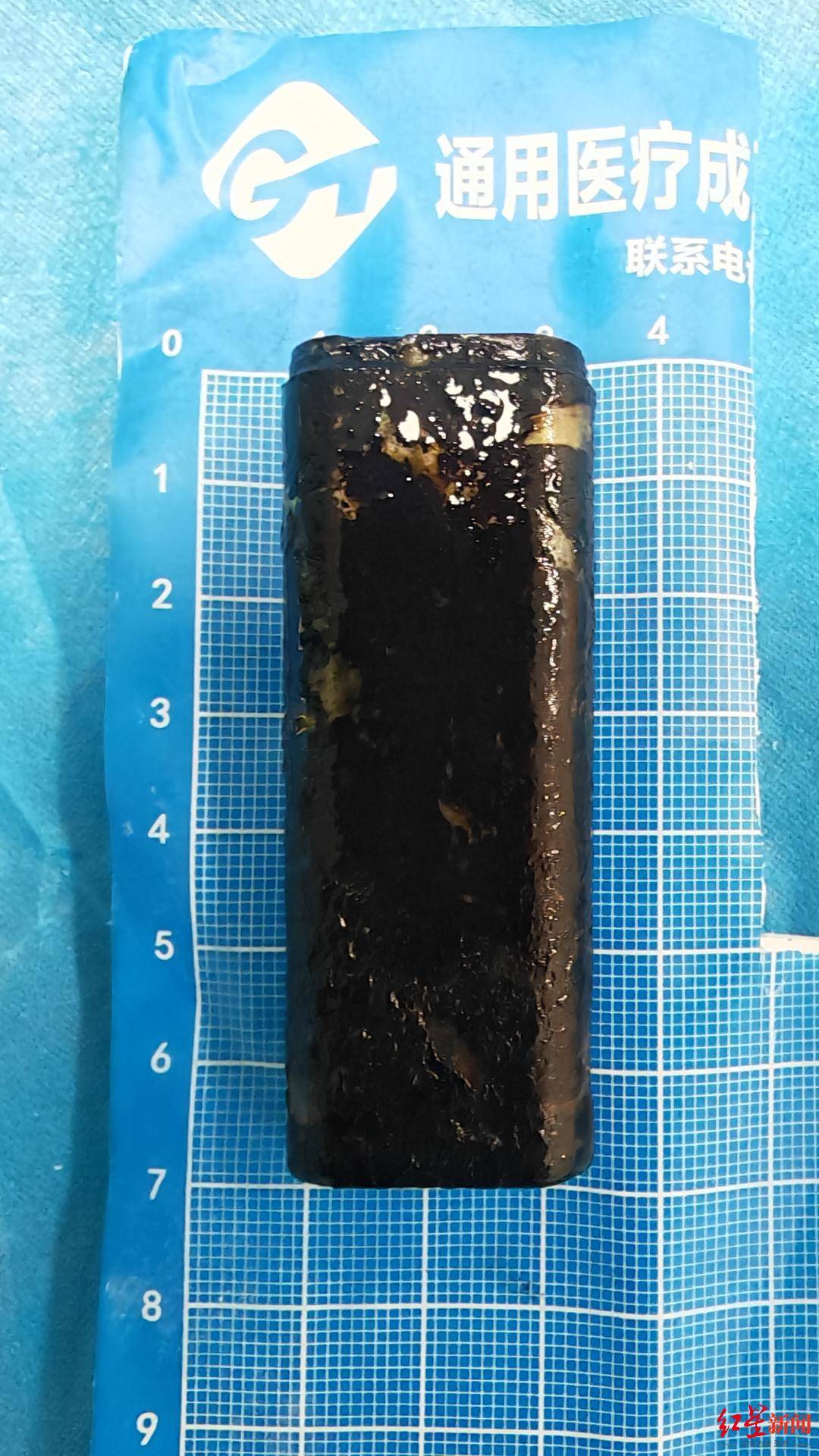 取出的打火机长约7厘米,外层覆盖黑色腐物。令医生惊讶的是,尽管在胃内停留三十余年,其结构仍基本完整,机内居然还有残留液体。