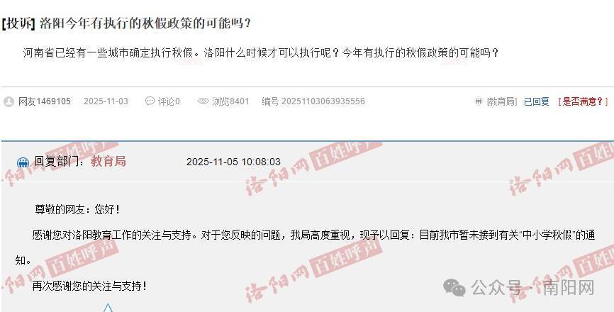 感谢您对洛阳教育工作的关注与支持。对于您反映的问题,我局高度重视,现予以回复:目前我市暂未接到有关 “中小学秋假” 的通知。