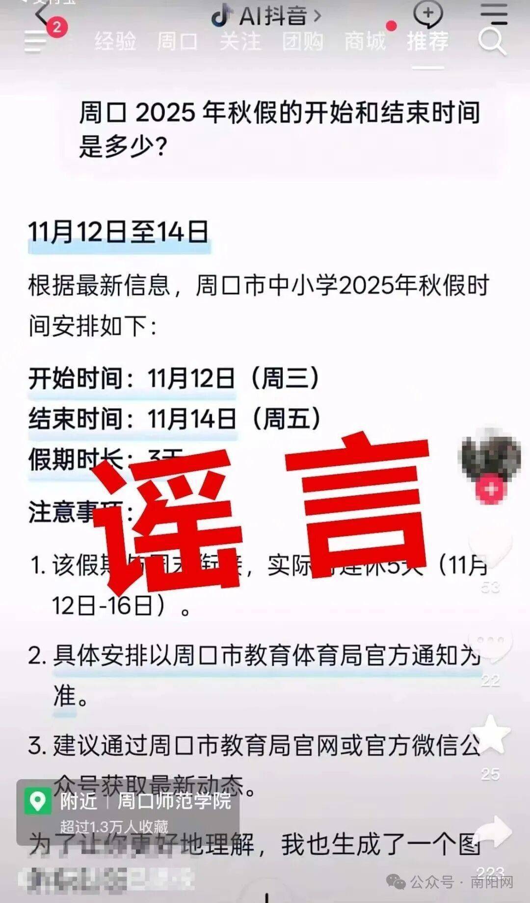 近期,部分自媒体平台发布河南多地推行中小学春秋放假的信息,使中小学春秋假成为社会热点。记者从周口市教体局获悉,有关周口市春秋假的消息不实,请大家不信谣、不传谣。