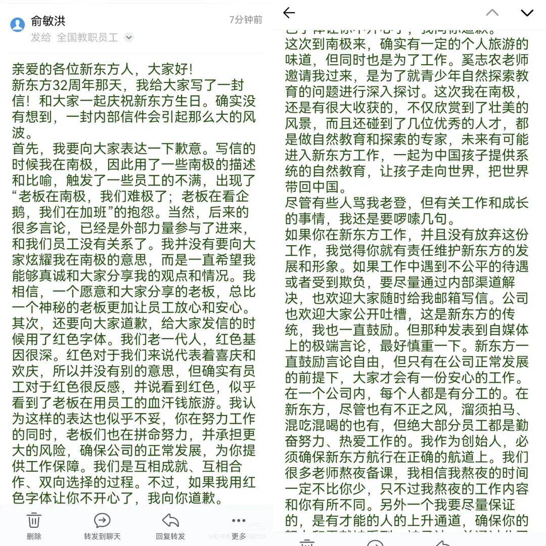 他表示,此前写信的时候他在南极,因此用了一些南极的描述和比喻,触发了一些员工的不满,出现了“老板在南极,我们难极了;老板在看企鹅,我们在加班”的抱怨。俞敏洪表示,他没有要向大家炫耀他在南极的意思,而是一直希望他能够真诚和大家分享他的观点和情况。