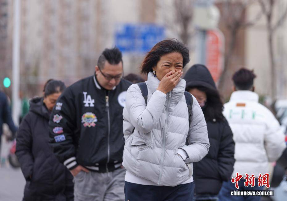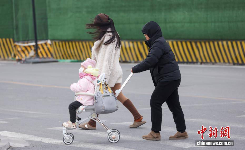 11月24日,北京,家长带着孩子在风中出行。当日,北京迎来大风降温天气。中新社记者 贾天勇 摄