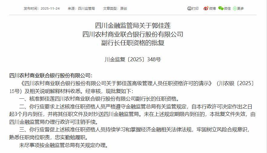 11月24日,国家金融监督管理总局四川监管局发布批复,核准郭佳莲四川农村商业联合银行副行长的任职资格。