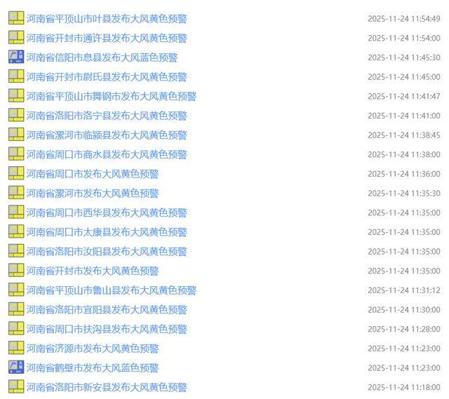 截至11月24日12时30分,河南共109个生效中,其中,多地发布大风黄色预警