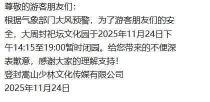 根据气象部门大风预警,为了游客朋友们的安全,大周封祀坛文化园于2025年11月24日下午14:15至19:00暂时闭园。