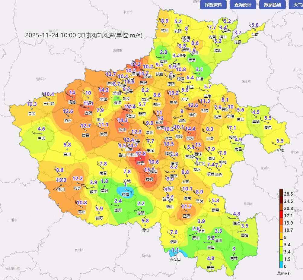 预计今天下午大风持续,全省有西北风5级左右,阵风7-8级,中西部、西北部部分地区阵风9-10级,淮河以北伴有扬沙或浮尘。明天大风减弱。