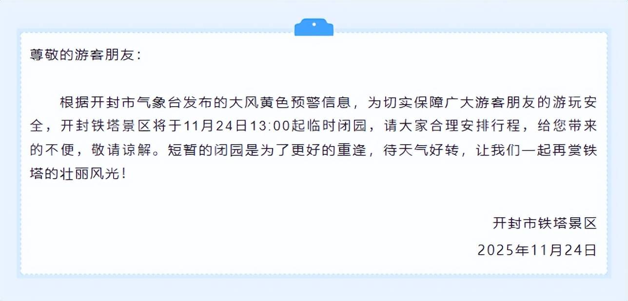 根据开封市气象台发布的大风黄色预警信息,为切实保障广大游客朋友的游玩安全,开封铁塔景区将于11月24日13:00起临时闭园,请大家合理安排行程。