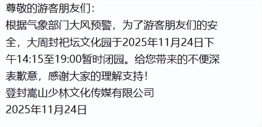 根据气象部门大风预警,为了游客朋友们的安全,大周封祀坛文化园于2025年11月24日14:15至19:00暂时闭园。