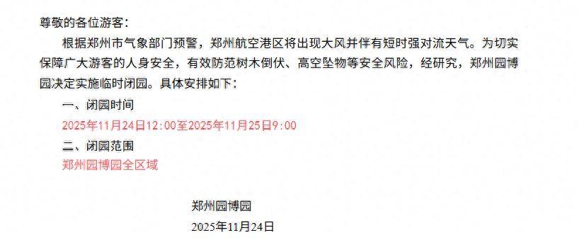 根据郑州市气象部门预警,郑州航空港区将出现大风并伴有短时强对流天气。为切实保障广大游客的人身安全,有效防范树木倒伏、高空坠物等安全风险,经研究,郑州园博园决定实施临时闭园。