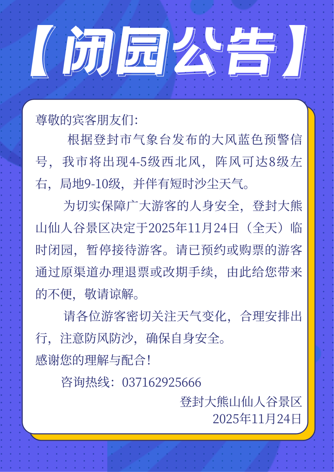 根据登封市气象台发布的大风蓝色预警信号,登封市将出现4-5级西北风,阵风可达8级左右,局地9-10级,并伴有短时沙尘天气。为切实保障广大游客的人身安全,登封大熊山仙人谷景区决定于2025年11月24日(全天)临时闭园,暂停接待游客。