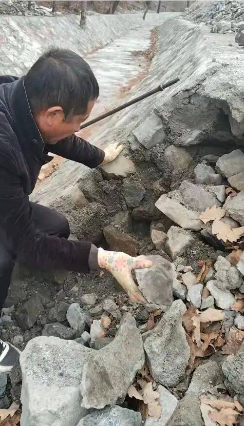 视频中,一名男子在一处水渠处,扒拉工程内浇筑的砂浆、石块等。石块一掰就掉,砂浆一抠就碎。男子说:“几个月了,水渠的挡墙上,石块一掰就下来了。先不说工程是不是合格的,水泥一抠就开了,这合格吗?”
