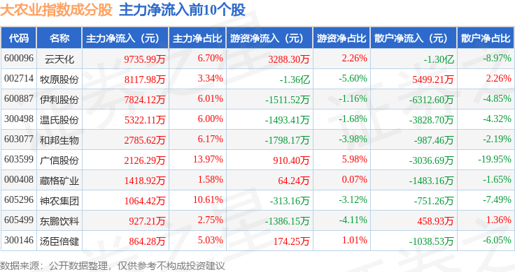 资金流向方面,大农业(399814)指数成份股当日主力资金净流出合计5.15亿元,游资资金净流入合计1.82亿元,散户资金净流入合计3.33亿元。成份股资金流向详情见下表: