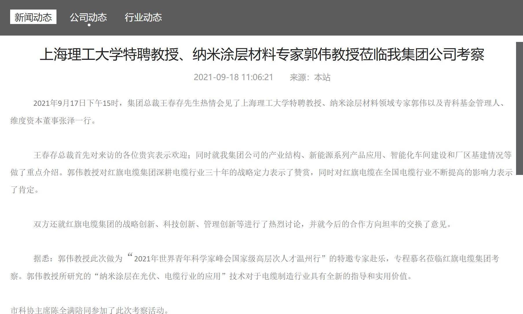然而,这场见面并非该公司主动邀请。文章中还有这样一段话:郭伟教授此次作为“2021年世界青年科学家峰会国家级高层次人才温州行”的特邀专家,专程慕名莅临红旗电缆集团考察。文章还提到,“郭伟教授所研究的‘纳米涂层在光伏、电缆行业的应用’技术对于电缆制造行业具有全新的指导和实用价值”。