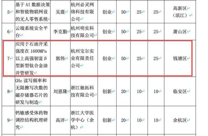 2022年9月,杭州市人力资源和社会保障局发布一则公告显示,郭伟入选《2022年度高层次留学回国人员在杭创新创业项目拟资助名单》。其经营的宝尔实业,以“应用于石油开采强度在1600MPa以上高强韧富β型新型钛合金油井管研发”项目,获得50万元资助额度,其中杭州市级批款25万元,钱塘区批款25万元。