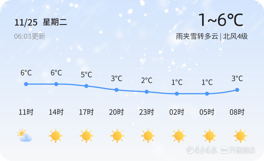 今天是2025年11月25日,星期二,农历十月初六。烟台市今日天气为雨夹雪转多云,气温介于1℃至6℃之间,北风4级,空气湿度70%,空气质量状况良好(PM2.5为33)。市民出行时请注意防风保暖,雨雪天气可能导致道路湿滑,建议减少不必要的户外活动,注意交通安全。