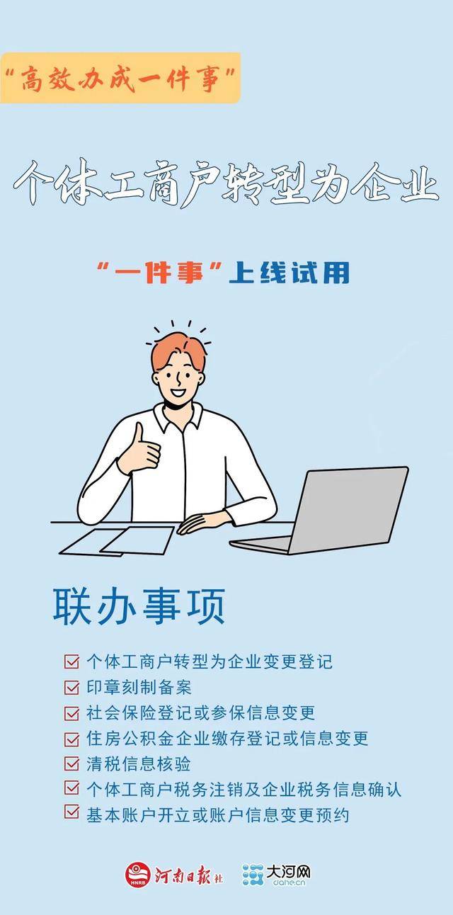 据了解,个体工商户转型为企业“一件事”已在全省范围内正式推行。登记机关依法登记且经营状态正常的个体工商户可以登录河南政务服务网在线办理,也可以到市、县政务服务中心咨询办理。对于材料齐全、符合规定条件的个体工商户,最多10个工作日可办结全部手续。