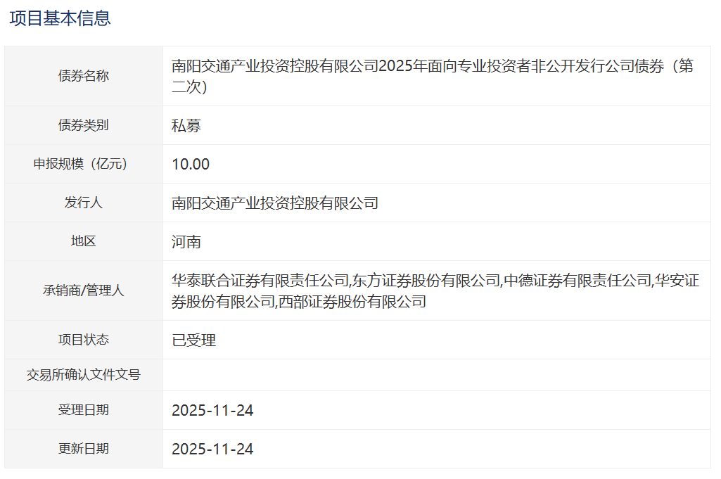 【大河财立方消息】11月25日消息,南阳交通产业投资控股有限公司2025年面向专业投资者非公开发行公司债券(第二次)项目获深交所受理。