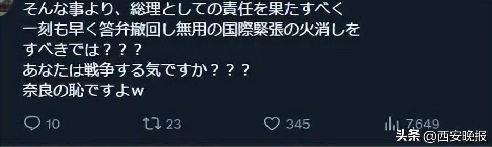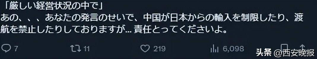帖文大意:因为你的发言,中国限制了日本商品进口、不鼓励赴日出行,请承担责任。