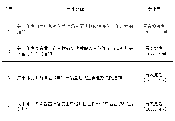 根据《山西省行政规范性文件制定与监督管理办法》(山西省人民政府令第274号)规定,按照省政府有关工作部署,我厅对现行行政规范性文件进行了集中清理,决定对《关于印发山西省规模化养殖场主要动物疫病净化工作方案的通知》等4个文件予以废止。