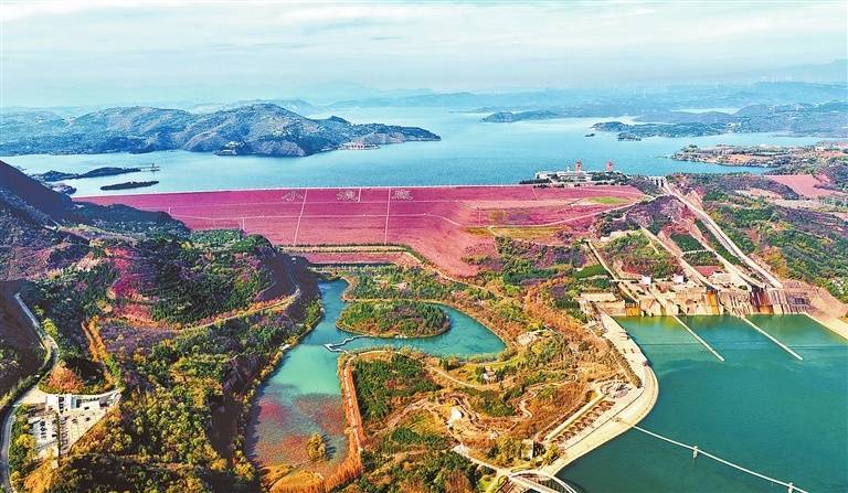 11月24日,位于洛阳市孟津区的黄河小浪底水利枢纽周边山峦起伏、色彩斑斓,下游河道绿水潺潺,成为冬日里的一道亮丽风景线。(郑占波 马绍磊 摄)