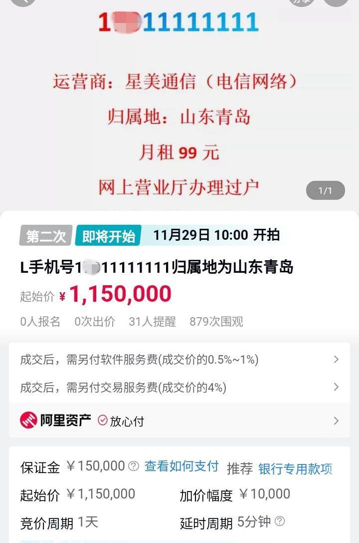 拍卖公告及标的物描述显示,该手机号码为1**11111111,月租为99元,无欠费及其他限制事项,号码归属地为山东青岛,运营商为星美通信(民营运营商)。该号码起拍价为115万元,参与竞拍者需提前交15万元的竞拍保证金,竞拍的增价幅度为1万元及其整倍数。竞价时间为11月29日10时至11月30日10时,竞买成功后,委托方将配合买受人办理手机号码过户事项,买受人须支付成交价0.5%至1%的软件服务费、成交价4%的交易服务费。