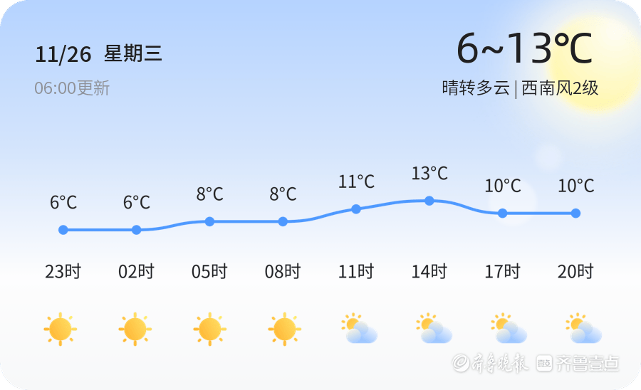 今天是2025年11月26日,星期三,农历十月初七。济南今日天气晴转多云,气温介于6℃至13℃之间,西南风2级,空气湿度29%,PM2.5指数为77,空气质量等级为良。市民外出时请注意保暖,适时添衣,同时由于天气晴朗,阳光较强,建议做好防晒措施。此外,今日风力较小,适合户外活动。