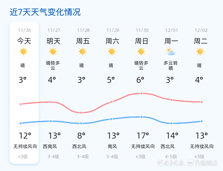 今天是2025年11月26日,星期三,农历十月初七。日照市今日天气晴朗,西风2级,气温适中,最高气温12℃,最低气温3℃。各区天气情况一致,均为晴朗天气,适合市民户外活动。当前温度4℃,空气湿度39%,PM2.5指数72,空气质量良好。 明日天气与今日相比有所变化,预计为晴转多云,西南风3-4级,气温略有上升,最高气温13℃,最低气温4℃。市民需注意风力变化,适当增添衣物。 未来三天,日照市天气以晴为主,气温波动不大,最高气温13℃,最低气温3℃。风力方面,部分地区可能出现3-4级西北风或南风,提醒市民注意防范大风天气对出行的影响。 温馨提示