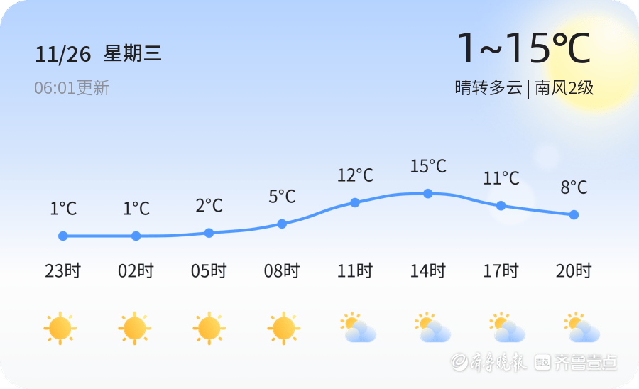 今日(11月26日,农历十月初七)淄博市天气晴转多云,气温为1℃至15℃,南风2级,空气湿度55%。空气质量良好,PM2.5指数为65,属于良级,对人体健康影响较小。市民今日出行时建议根据温度变化适时增减衣物,早晚温差较大,注意保暖防寒,中午时段天气较为温暖,适宜户外活动。预计上午11时左右气温将逐渐升高,建议市民安排户外活动在温度适宜的时段进行。
