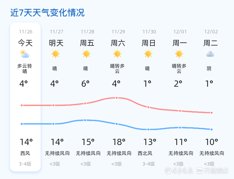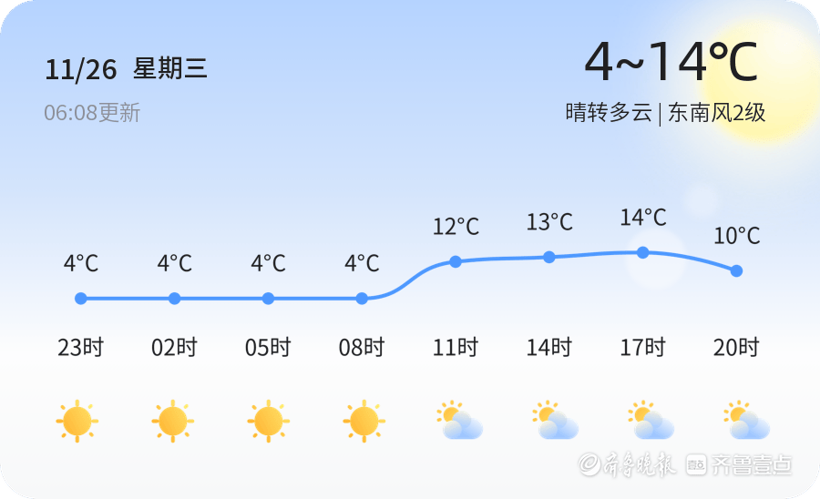 今天是11月26日,农历十月初七,菏泽市迎来了一天的晴转多云天气。目前温度为2.1℃,整体天气状况良好,东南风2级,空气湿度65%,PM2.5指数为86,空气质量良好。今天白天最高气温为14℃,最低气温为4℃。各区天气情况基本一致,均为晴转多云,适合市民外出活动。