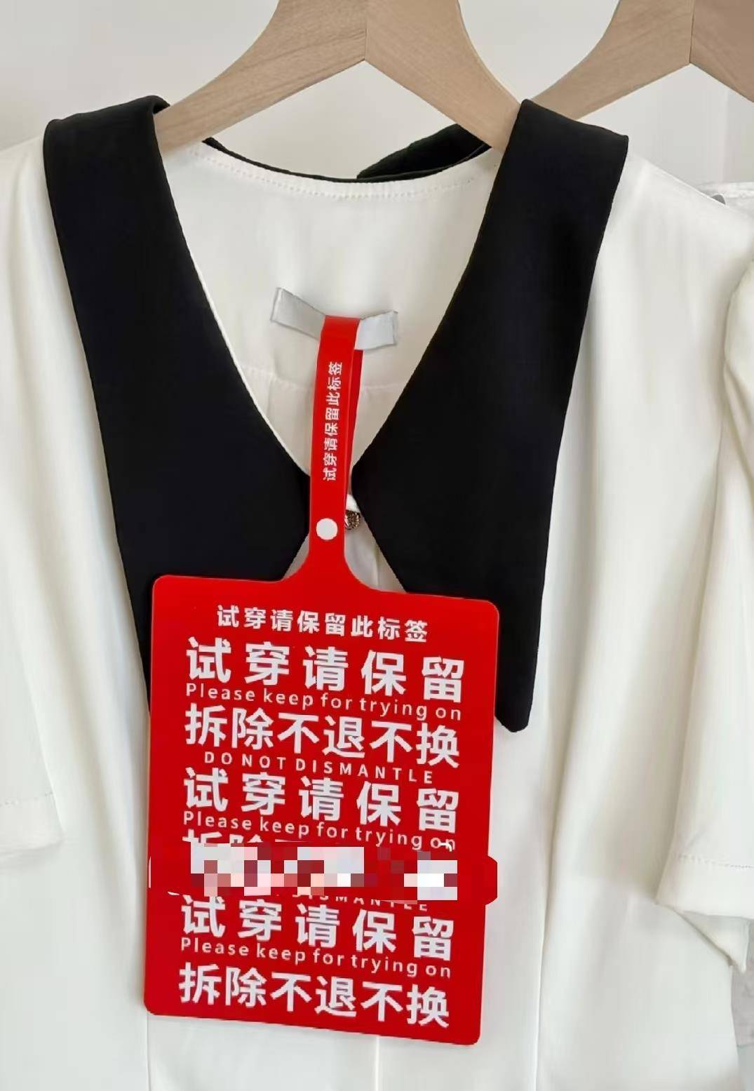 “我们两年前就开始做这个了。”吴先生说,最初,有一家中高端女装品牌因退货率居高不下,深受恶意退货困扰,便专门找上门来,定制了这种特殊吊牌。直到今年才开始大批量生产现货。小批量定制的单价,大概在两到三毛之间。他说,吊牌用的是一次性材料,“韧性很强,很难扯断”。