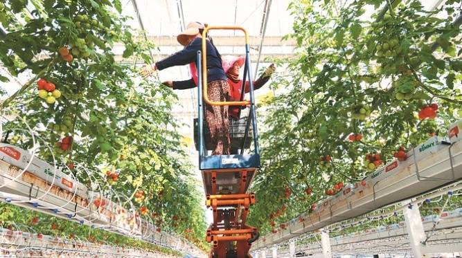 11月25日,连云港市海州区浦南镇番茄庄园工作人员在管护小番茄。近年来,连云港市海州区浦南镇积极探索生态休闲都市农业发展新模式,大力发展品牌番茄周边产业,火红的小番茄成为当地种植户走上致富路的大产业。(耿玉和)
