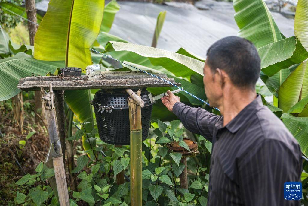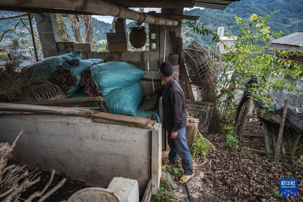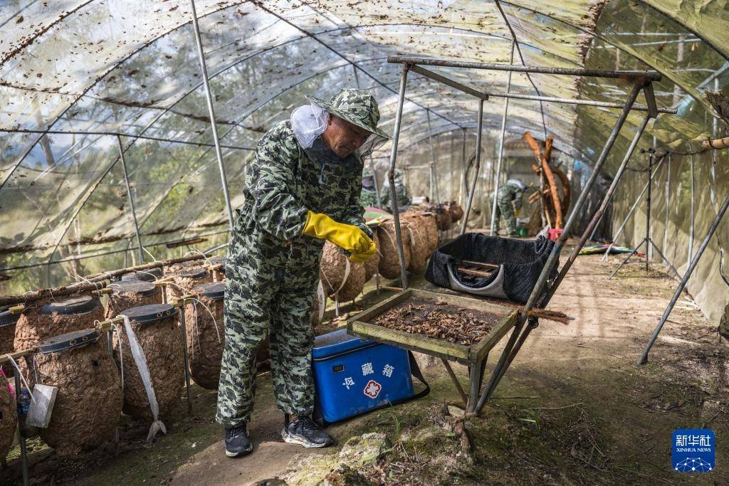 11月19日,在云南省保山市龙陵县龙山镇河头村,村民在养蜂棚内查看胡蜂。