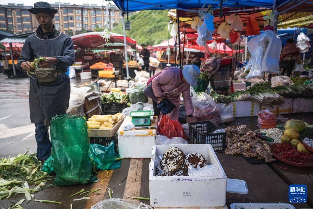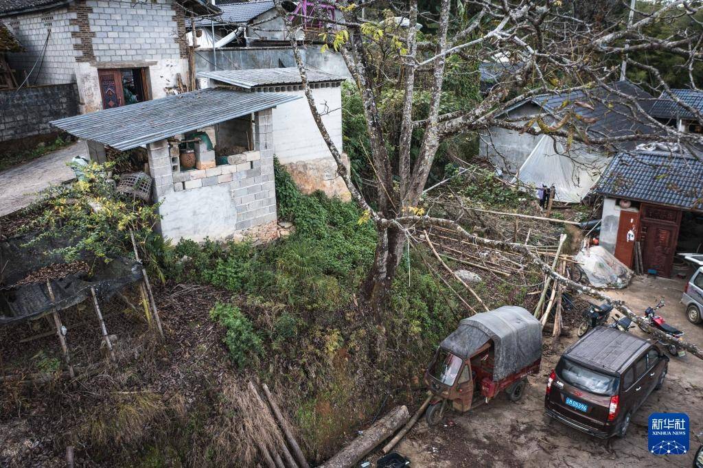11月19日,商人在云南省保山市龙陵县龙山镇河头村收购旧家具,背景棚房处可见村民养殖的胡蜂。