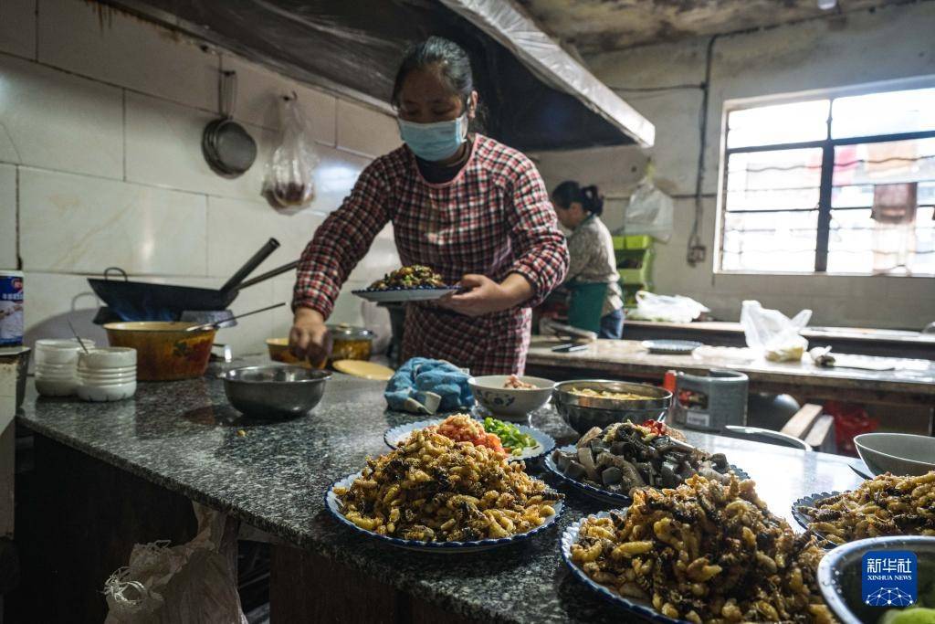 11月19日,在云南省保山市龙陵县龙山镇,一家餐馆在制作菜品炸胡蜂蛹。
