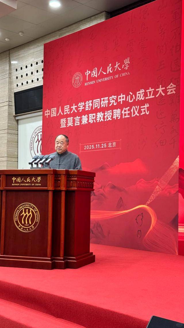 11月25日,中国人民大学舒同研究中心成立大会暨莫言兼职教授聘任仪式25日在北京举行。会上,中国作家协会副主席、诺贝尔文学奖获得者莫言受聘为中国人民大学兼职教授。
