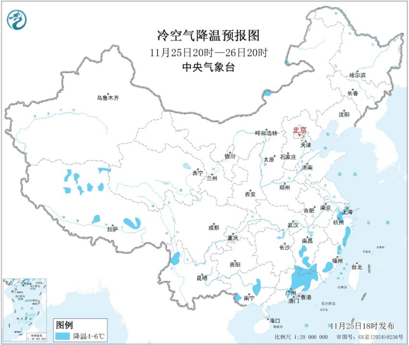 并且另一股冷空气正在袭来。根据中央气象台消息,25日夜间至28日,新一股较强冷空气自西向东影响我国大部地区,长江以北大部地区将有4℃—8℃降温,部分地区降温10℃—12℃。从公布的冷空气降温预报图看,11月25日20时—26日20时,广东东北部市县将降温4℃—6℃。