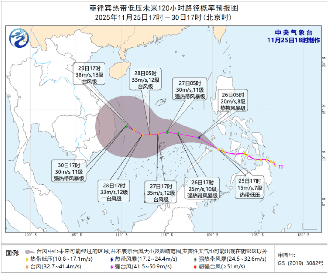同时,台风也有动静。在24日上午,菲律宾以东的热带扰动加强为热带低压。截至25日17时,热带低压中心位于菲律宾苏禄海北部,预计其将以每小时20—25公里的速度向西偏北方向移动,并于26日凌晨进入南海南部海域,强度逐渐加强,最强可达强热带风暴级或台风级(11—12级)。不过由于其路径偏南,主要影响南海中南部海面,对广东海面和陆地无直接影响。