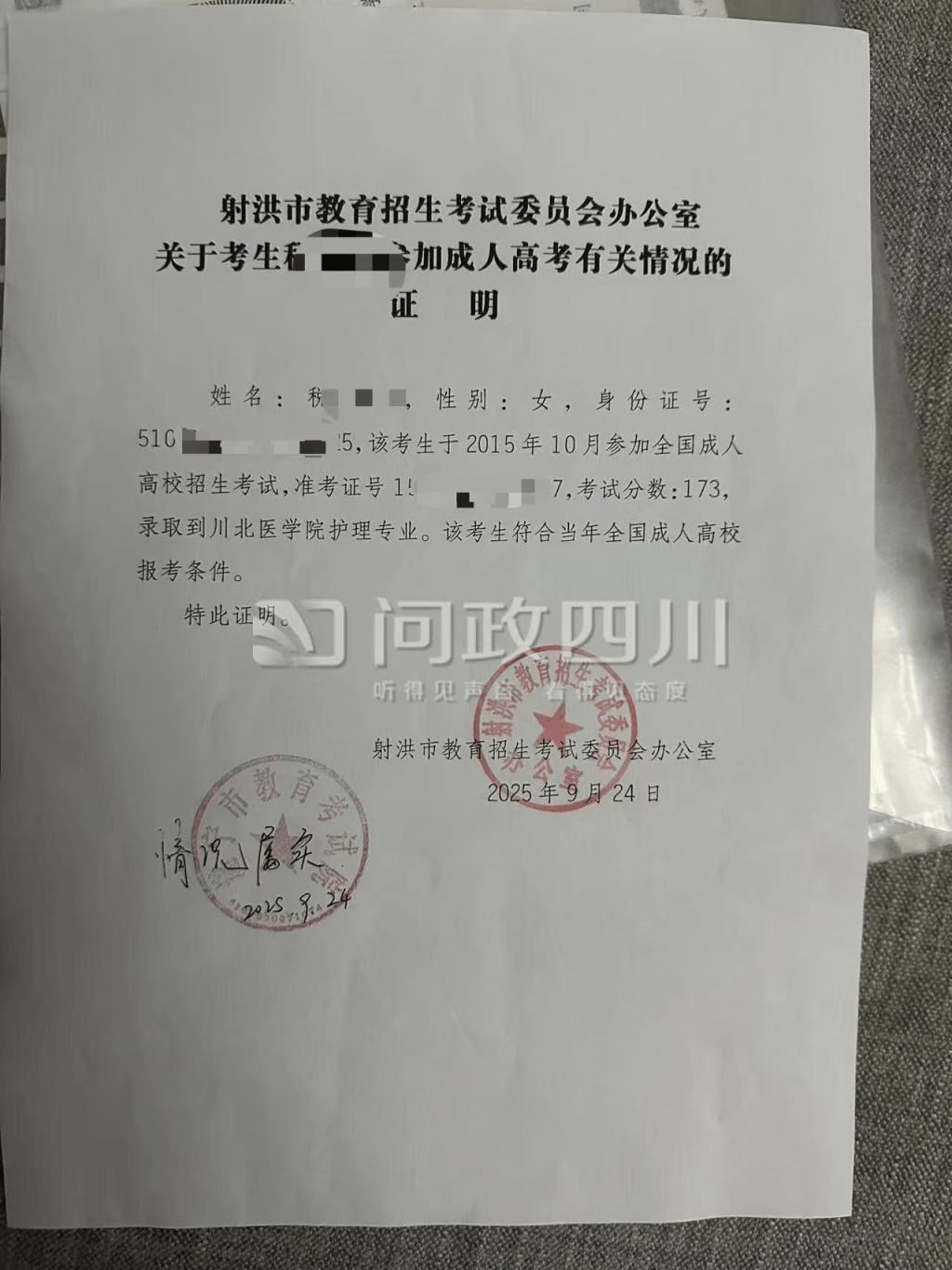 射洪市教育招生考试委员会办公室出具的证明材料。 问政四川 图
