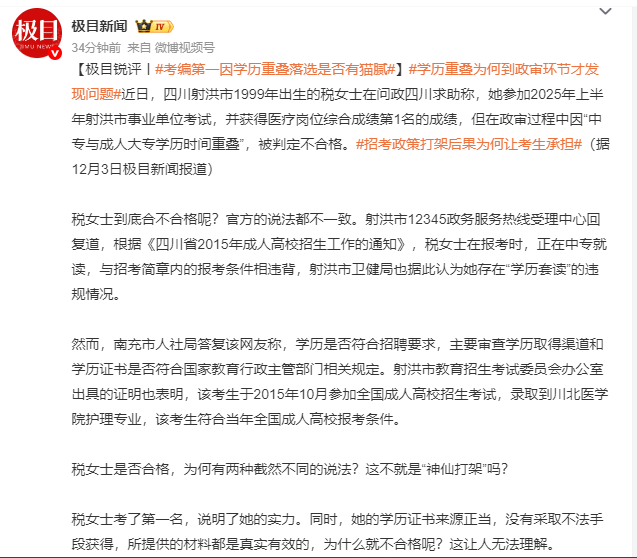 近日,四川射洪市1999年出生的税女士在问政四川求助称,她参加2025年上半年射洪市事业单位考试,并获得医疗岗位综合成绩第1名的成绩,但在政审过程中因“中专与成人大专学历时间重叠”,被判定不合格。#招考政策打架后果为何让考生承担#(据12月3日极目新闻报道)