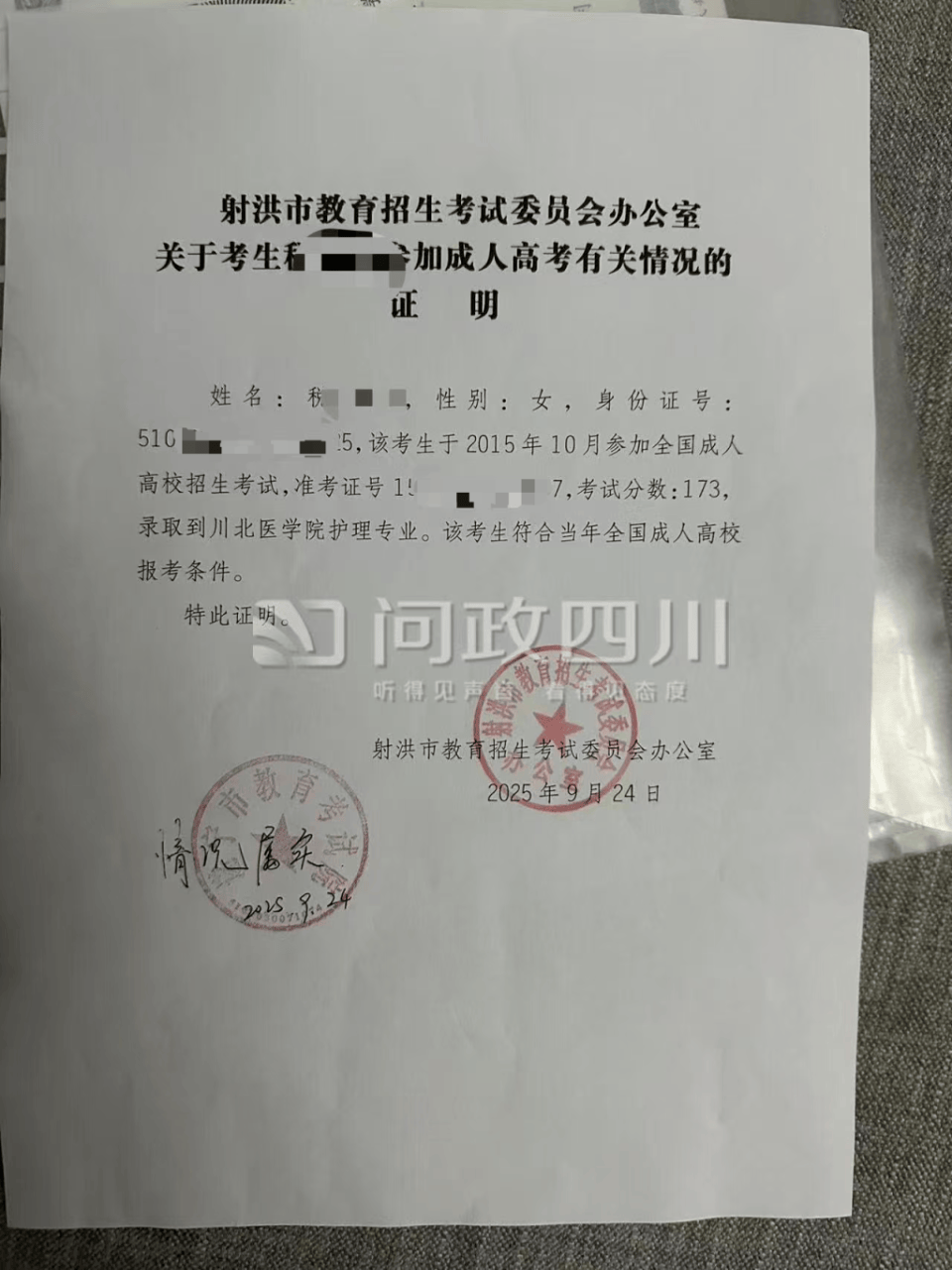 射洪市教育招生考试委员会办公室出具的证明材料显示,“该考生符合当年全国成人高校报考条件”。图源:问政四川