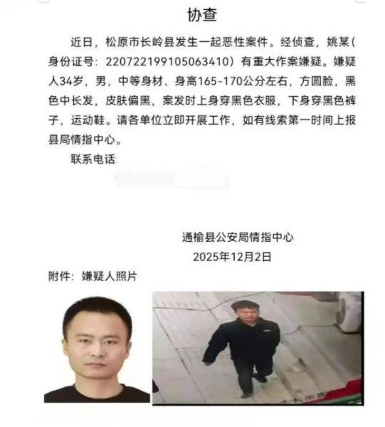 网传协查信息截图显示,近日,吉林省松原市长岭县发生一起恶性案件。经侦查,姚某有重大作案嫌疑。嫌疑人34岁,男,中等身材,身高165-170厘米左右,方圆脸,黑色中长发,皮肤偏黑,案发时上身穿黑色衣服,下身穿黑色裤子,运动鞋。“请各单位立即开展工作,如有线索第一时间上报县局情指中心。”落款为通榆县公安局情指中心。