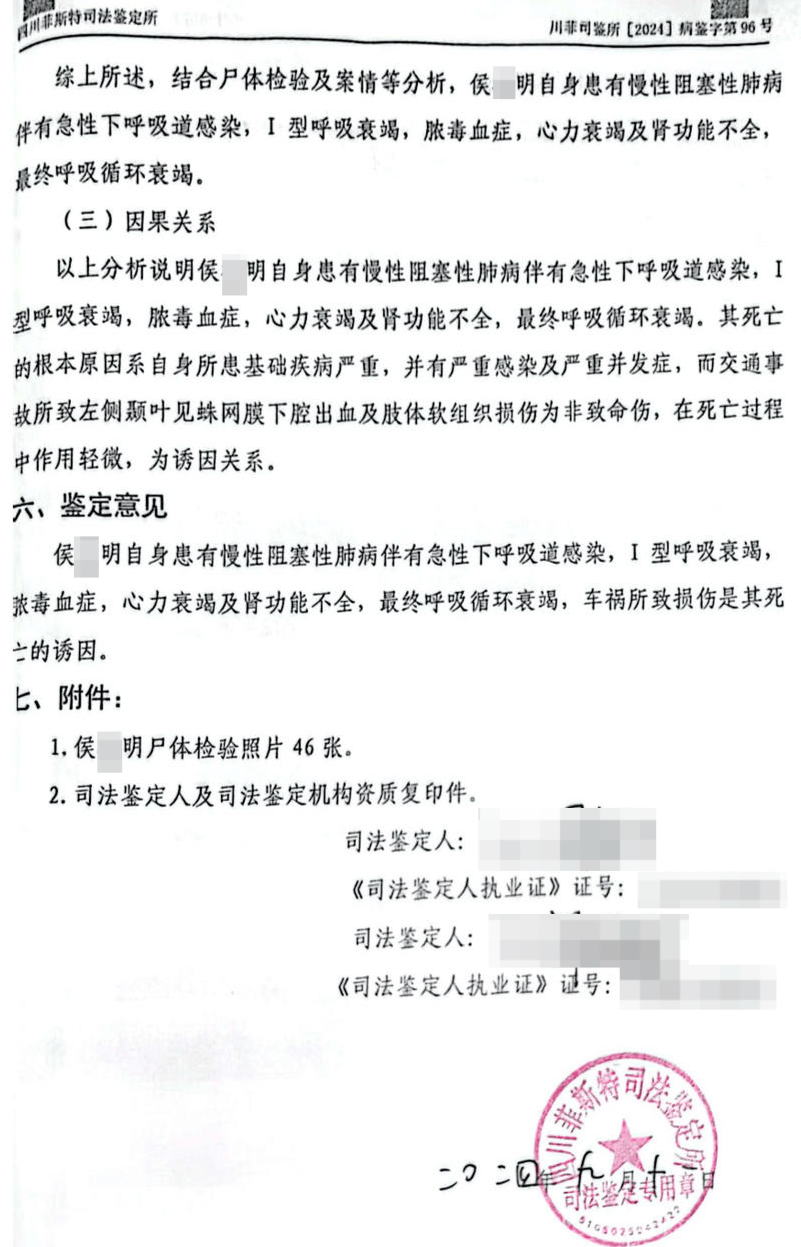 2024年9月11日,四川菲斯特司法鉴定所出具的鉴定意见认为,死者侯某明自身患有慢性阻塞性肺病伴有急性下呼吸道感染,I型呼吸衰竭,脓毒血症,心力衰竭及肾功能不全,最终呼吸循环衰竭,车祸所致损伤是其死亡的诱因。