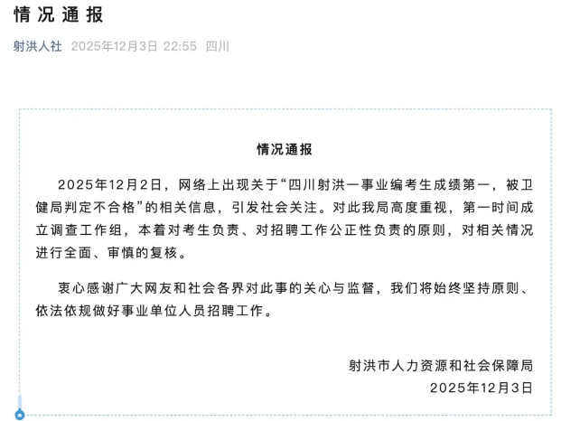 2025年12月2日,网络上出现关于“四川射洪一事业编考生成绩第一,被卫健局判定不合格”的相关信息,引发社会关注。12月3日,四川省射洪市人社局发布情况通报表示,已成立调查工作组,对相关情况进行全面、审慎的复核。