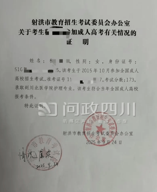 射洪市教育招生考试委员会办公室出具的证明也表明,该考生于2015年10月参加全国成人高校招生考试,录取到川北医学院护理专业。该考生符合当年全国成人高校报考条件。