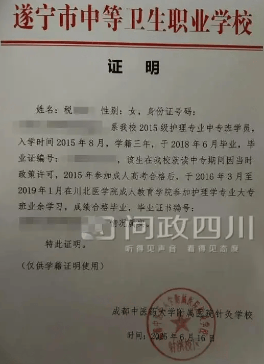 税女士在问政四川上展示了多份证明材料。其中成都中医药大学附属针灸学院出具的证明写道,税女士系该校2015级护理专业中专班学员,入学时间2015年8月,学籍三年,于2018年6月毕业。