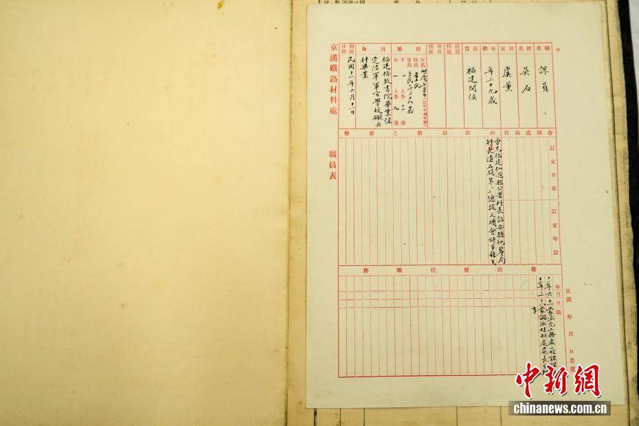 河南省档案馆近日公布一份题为《中华国有京汉铁路管理局吴石履历表》的珍贵档案,为吴石将军早年工作经历提供了新的史料线索。12月4日,记者在河南省档案馆特藏档案库查阅并拍摄了这份档案。图为吴石在京汉铁路管理局的履历表(部分)。中新社记者 范晓恒 摄