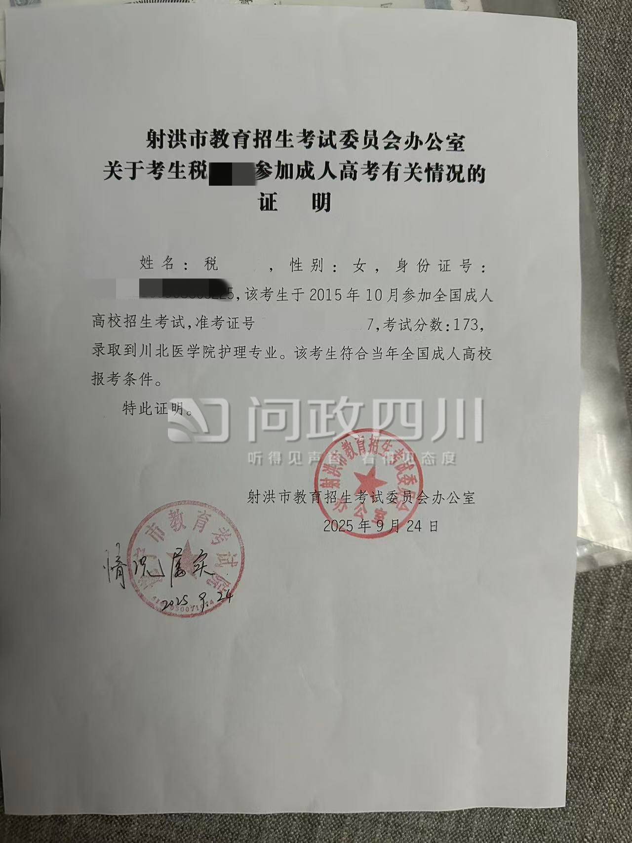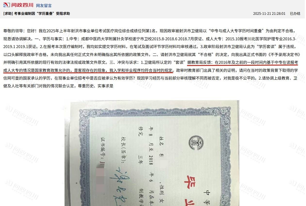 四川射洪市26岁的税女士反映,最近报考当地一卫生院的护理人员,综合成绩第1,但政审中因“中专与成人大专学历时间重叠”,被判定不合格。其提供的材料显示,她在读中专期间的2015年,参加成人高考读了大专。